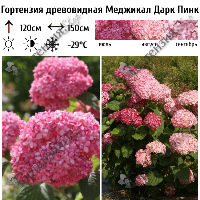 Гортензия древовидная 'Меджикал Дарк Пинк' -  отличается крепкими стеблями. Высота куста  до 120 см, ширина до 150 см. Листья  округлые темно-зеленые, зацветает в июле, розово-красными цветами. Почва должна быть кислая, влажная  но без застоя воды. Зимостойкость-29С. В более холодных регионах цветочные почки могут замерзнуть без защиты.