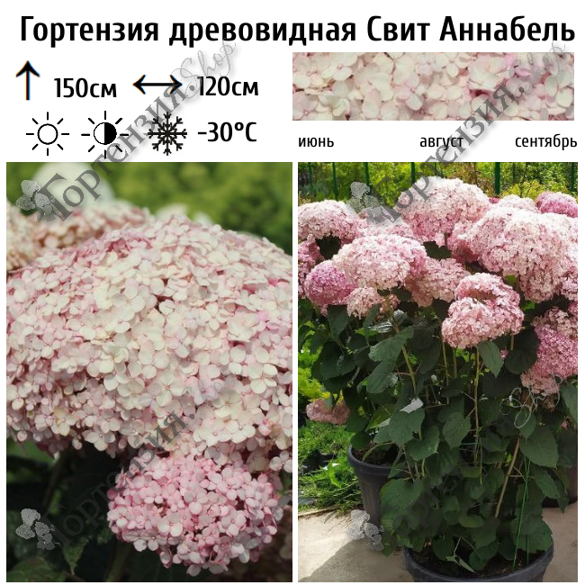 Древовидная гортензия Свит Аннабель – миниатюрный кустарник, достигающий 1 м в высоту и ширину д 1,2м. Побеги прямые, не сгибаются под тяжестью соцветий. Листья широкие, желтовато–зеленого цвета, с зубчиками по краям. Свит Аннабель отличается яркими цветками от малинового до нежно–розового цвета. Они собраны в шаровидные соцветия, 20 см. Цветение с июня и до сентября. Гортензия Свит Аннабель великолепно смотрится в небольших группах на газоне. Хороша и в одиночных посадках. Это делает ее неоценимым дополнением к смешанному или кустарниковому бордюру, а также к большим патио. Пригодна для выращивания в горшке на балконе или террасе. Соцветия часто используется для сухих букетов.