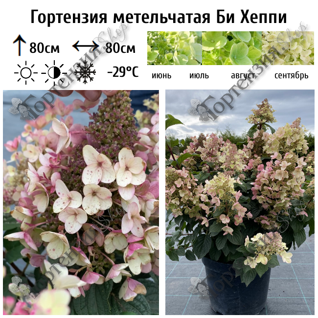 Гортензия метельчатая (Hydrangea paniculata) Би Хеппи - низкорослый сорт высотой до 80-100 см. Во время цветения на кустарнике образуются соцветия 15-20 см, которые в начале роста обладают округлой формой, а позже становятся продолговатыми, конусообразными. Их кисти объёмные, состоят из многочисленных плотно прижатых друг к другу цветков. Окрас варьируется в зависимости от времени произрастания: на начальном этапе они имеют красивый лимонно-зелёный оттенок, ближе к осени приобретают насыщенный белый окрас. Соцветия формируются на молодых побегах нынешнего года. Подходит для выращивания в контейнере.