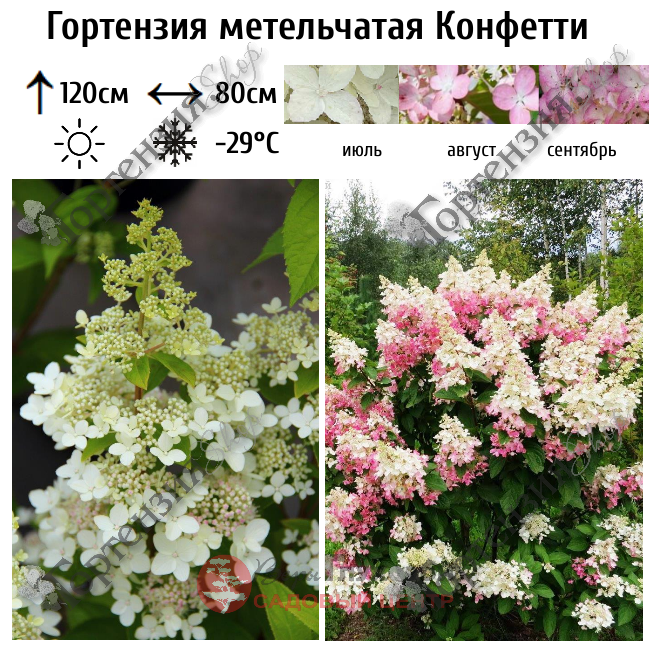 Гортензия Конфетти (Confetti) - образует куст от 1,2 до 1,3 метров. Шикарная крона, выровненная, симметричная, слегка расклешенная. Ветки прямые и жесткие, растут вертикально вверх. Метелка пирамидальной формы - 30 см, состоит из стерильных и фертильных цветков, конец пирамидки очень острый. Стерильные цветки достаточно крупные и достигают в диаметре 4-5 см. Расположены они очень ровным плотным каскадом и при полном раскрытии перекрывают стерильные цветочки. Цветки белые, и очень длительное время сохраняют белый цвет. К концу цветения они слегка розовеют. Нежно-розовый цвет цветения напоминает розовый зефир. Кончики очень долго остаются светлыми. Лист темно-зелёный, с утопленными прожилками. Он прекрасно держит форму, обильно цветет, не разваливается, не требует подвязки. Любит солнечные места, но может адаптироваться и в полутени. Зимостоек.