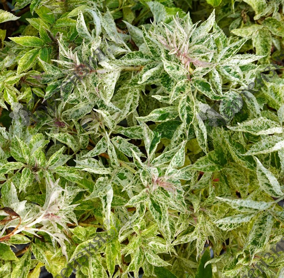 Один из красивых декоративных сортов растения, который часто используют для озеленения участков. Вырастает бузина максимум до 2 м в высоту, но при этом формирует пышную раскидистую крону. Хотя растет куст медленно, диаметр кроны может достигать 1,5 м. Побеги раскидистые, покрытые светло-серой корой. Главное достоинство сорта – эффектная раскраска листьев. Они крупные, перисто-рассеченные. Основной фон представлен в темно-зеленом цвете, а по всей листовой пластине рассыпаны белые пятна. Они могут иметь разную форму и величину, вместе же составляют причудливый рисунок.