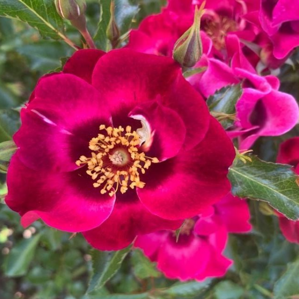 Роза миниатюрная 'Bravo Babylon Eyes' (Rose miniature 'Bravo Babylon Eyes') - Сорт серии 'Babylon Eyes'. Кустарник c компактной, плотной кроной, высотой до 60 см. Листья жесткие, блестящие. Цветение обильное, продолжительное с июня по октябрь. Цветы простые (4-8 лепестков), красные с пурпурным глазком по центру, тычинки и пестик выделяются заметно. Они устойчивы как к жаре, так и к засухе, а также к морозам. Почвы предпочитает плодородные, дренированные. Используются в одиночных и групповых посадках, как элемент живой изгороди.