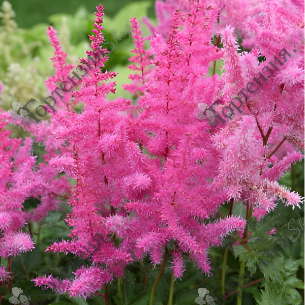 Астильба Арендса  'Глория Пурпурея цветки насыщенно-розовые, прицветники очень плотные и эффектные.Пушистые фиолетово-розовые соцветия высоко держатся на крепких стеблях . Красивая листва, распускаясь, приобретает бронзовый оттенок, а летом становится зеленой. Это самый яркий из розовых астильб. Считается одним из самых ранних сортов. Хорошо растёт в тени и переносит влажные почвы.