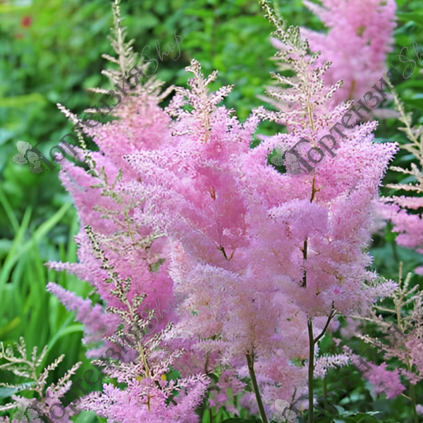 Астильба Арендса Катлея (Astilbe arendsii 'Cattleya') - многолетнее цветущее растение, выотой до 70 см. Листья темно зеленые, дважды или трижды перисто-рассеченные. Цветет с июля по август мелкими, нежно- розовыми цветами, объединенными в крупную метелку. Почвы предпочитает нейтральные, плодородные увлажненные. Используется в  альпинарии, рокарии, искуственных мини-водоемах, миксбордерах, бордюрах. Морозостойкость -34С.