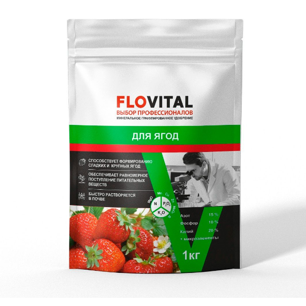 Комплексное минеральное удобрение для полноценного питания ягод. Повышает сахаристость плодов, вкусовые качества продукции за счёт большого состава микроэлементов, стимулирующих различные ростовые процессы. Состав и соотношение элементов питания подобраны с учетом биологических особенностей культуры, что обеспечивает активное плодоношение культуры.
